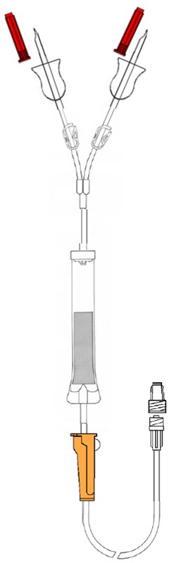 Le set à transfusion relie la poche de sang et le cathéter posé chez le patient.