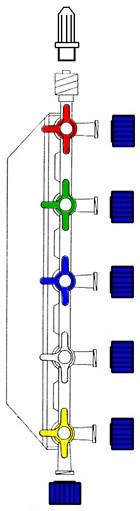Als er verschillende infusen of medicatie moet toegediend worden, kan ervoor gekozen worden om gebruik te maken van een kranenblok. Ook hier duidt het beentje van het kraantje aan of de leiding open staat. Kranenbalk alleen of met een verlengleiding.